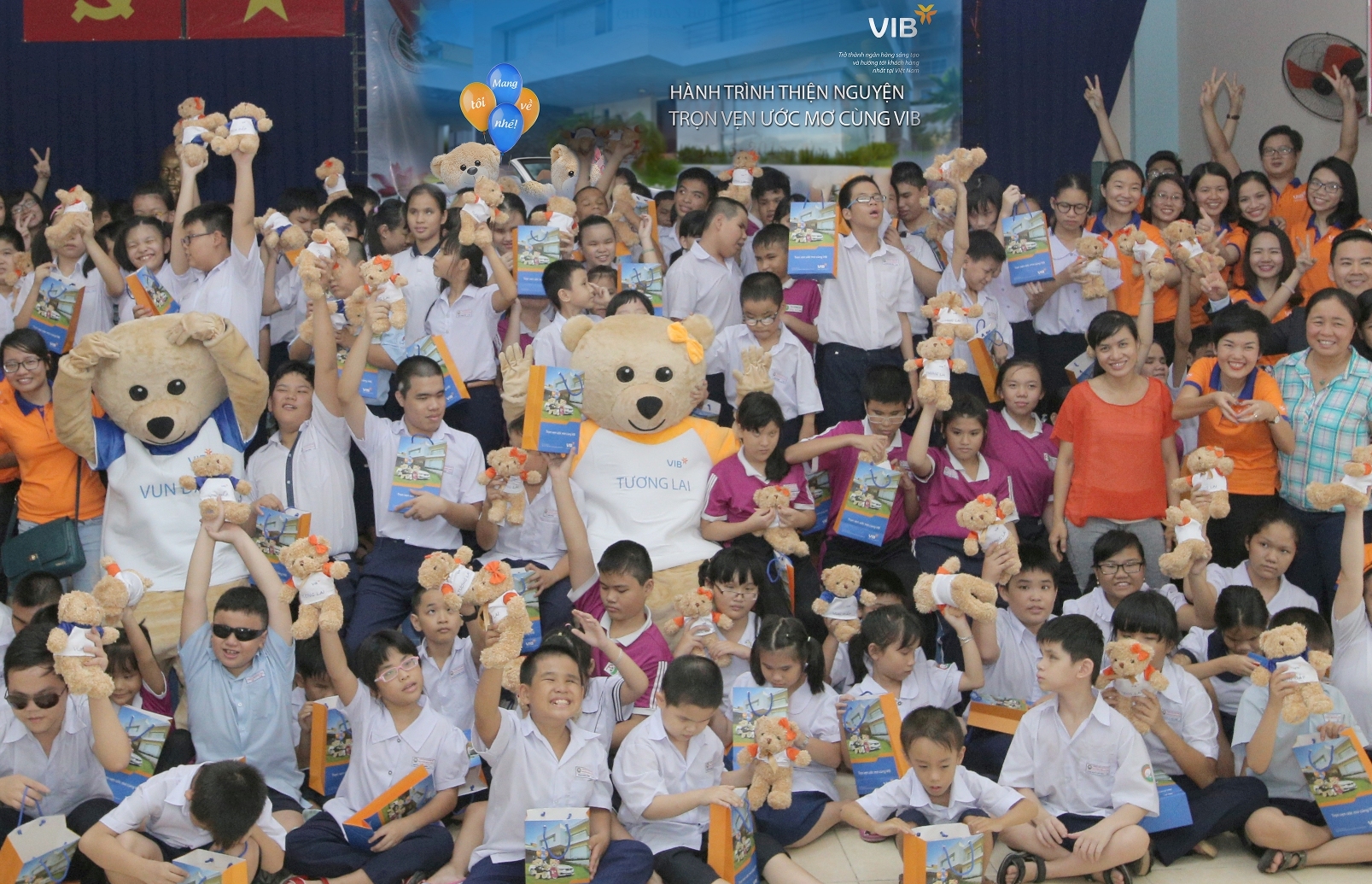 Hành trình “Trọn vẹn ước mơ cùng VIB” được triển khai từ Bắc chí Nam với biểu tượng xuyên suốt là các chú gấu VIB Vun Đắp – Tương Lai. Tại mỗi điểm dừng, hành trình không chỉ ủng hộ vật chất, góp phần giúp các hoàn cảnh kém may mắn có điều kiện sinh hoạt tốt hơn mà còn mang đến món quà tinh thần rất được các trẻ em rất yêu thích là những chú gấu bông cao cấp VIB và chương trình giao lưu được dàn dựng và tham gia bởi chính CBNV ngân hàng cùng các chú gấu VIB Vun đắp – Tương lai. Kết thúc hành trình, VIB đã ghé thăm 11 địa điểm trao tặng gấu bông cao cấp cho 1.100 trẻ em kém may mắn và hỗ trợ giáo dục bằng tiền mặt, nhu yếu phẩm cho các trường với tổng giá trị gần 400 triệu đồng từ ủng hộ của ngân hàng và đóng góp của CBNV VIB.