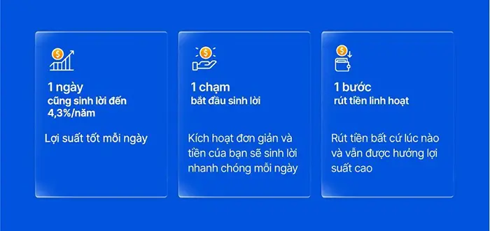 Ở tầng đầu tiên, tài khoản Siêu Lợi Suất được thiết kế cho dòng tiền cần linh hoạt mỗi ngày. Ba điểm nổi bật khiến sản phẩm này nhanh chóng tạo dấu ấn trên thị trường là: 1 ngày cũng sinh lời đến 4,3%/năm; 1 chạm bắt đầu sinh lời; 1 bước rút tiền linh hoạt.